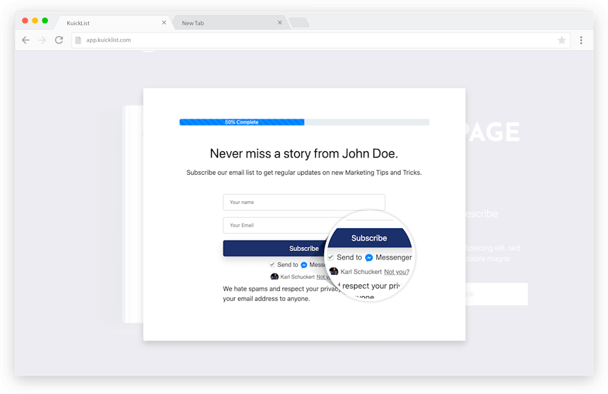 One of the best things about Kuicklist is that it allows you to build a list with traditional email marketing and or Facebook™ chatbot marketing. Leveraging Facebook™ huge data source.